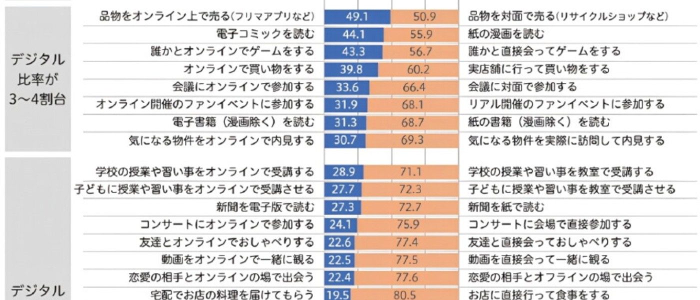 最讓人意外的是,高達72.7%的日本人仍在閱讀紙本報紙!而在遊戲領域,竟然有56.7%的人還是喜歡面對面玩遊戲,而不是線上對戰。電子書的普及率也僅有31.3%,遠低於紙本書籍的68.7%。
