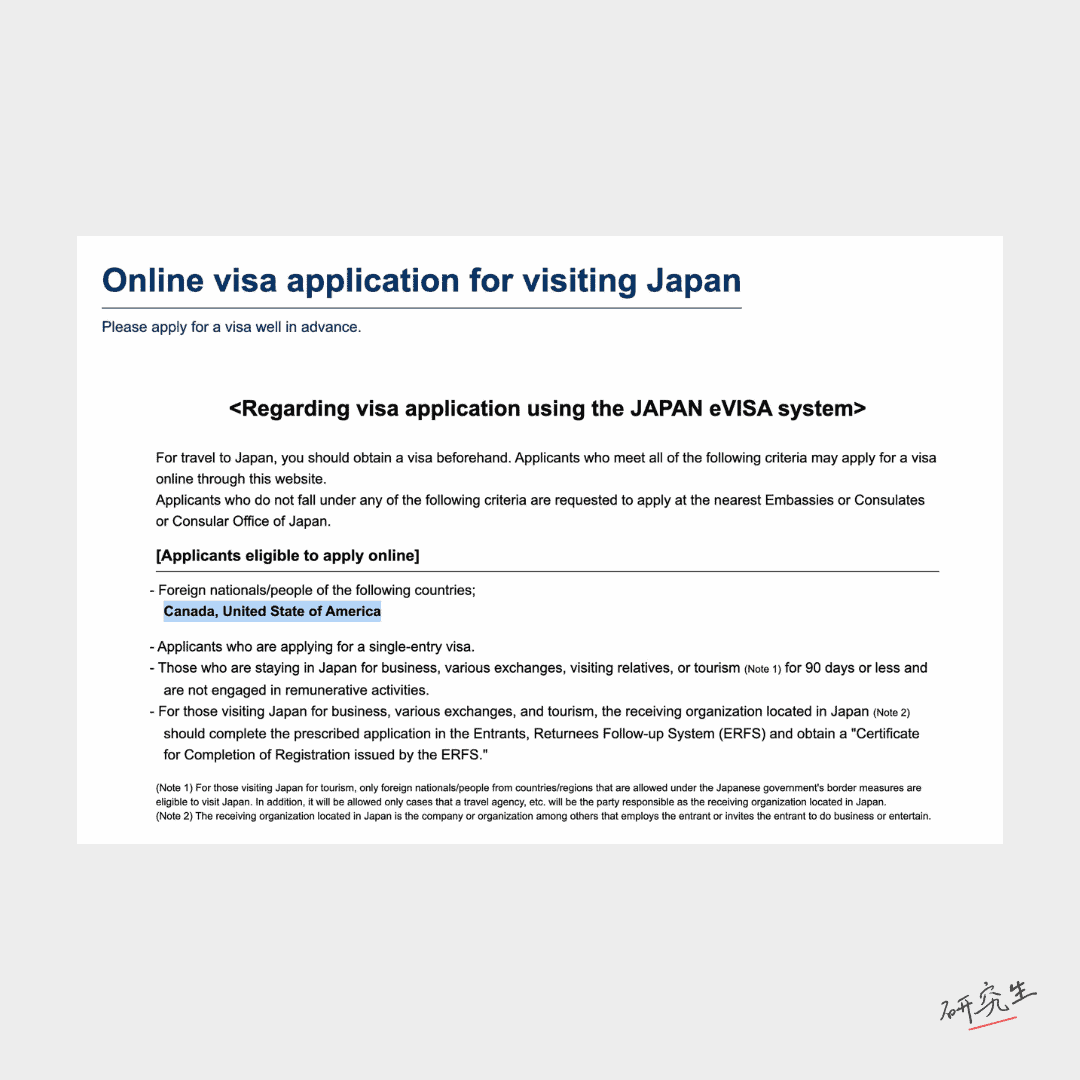 日本將於 8/18 開始,開放美國籍和加拿大籍線上申請簽證。簽證的規則跟現行的一樣,要是商務簽證,或是團體旅行,並且取得 ERFS 的受付済証。