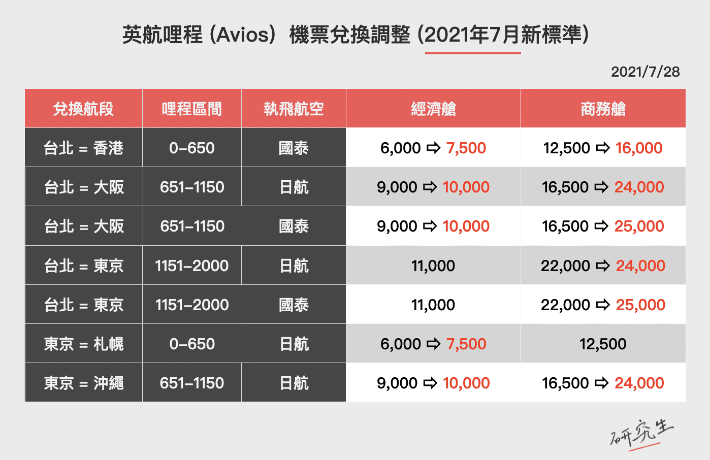- 經過測試,同樣的航點,如果是不同的航空公司,兌換標準也不一樣。