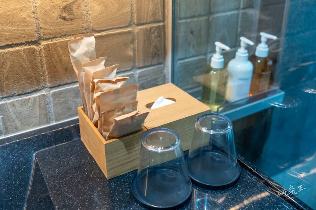 桌上放了可以重複使用的杯子,可以到一樓去裝飲料喝。一樓有咖啡機,碳酸飲料機,在住宿期間都可以免費享用。當然也可以在房間自己泡咖啡,煮泡麵。
