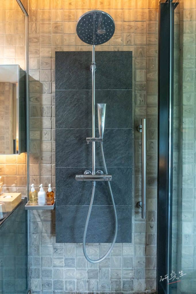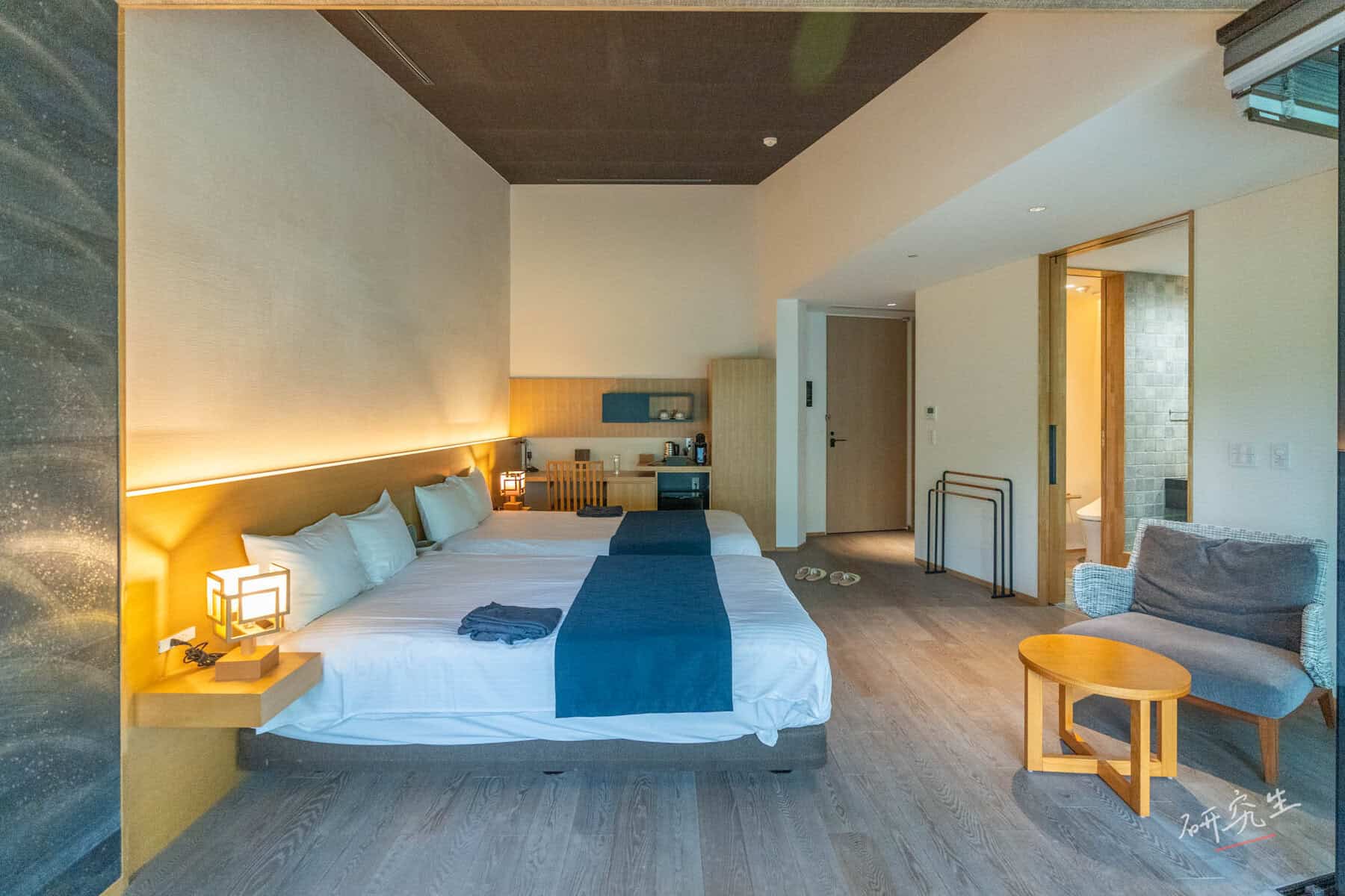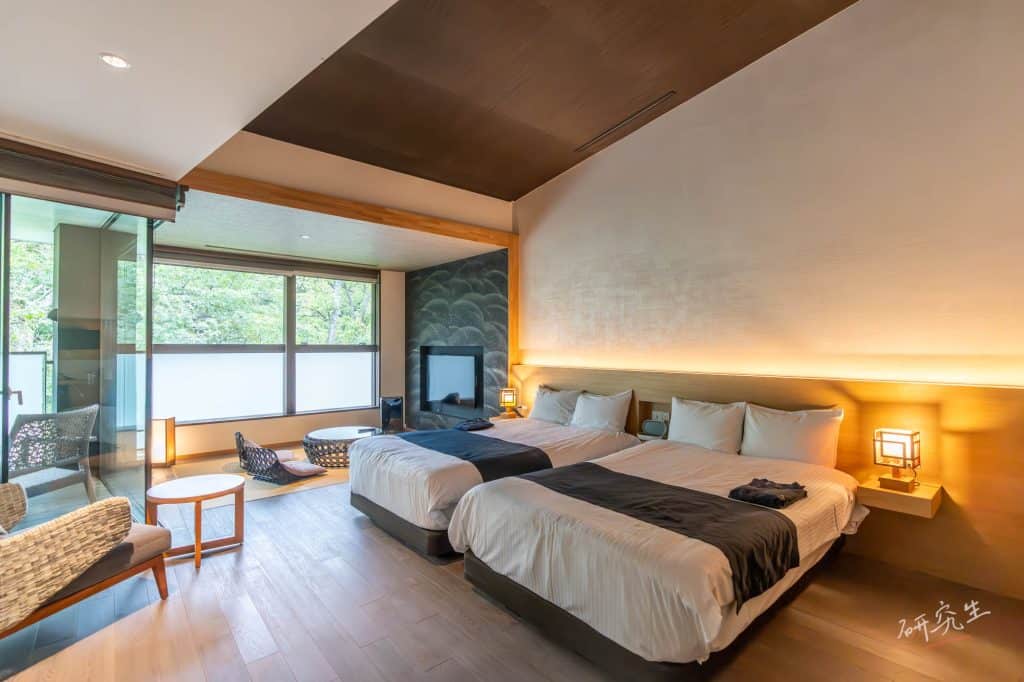房間分成三個部分,一部分是兩張大床,另一部分是榻榻米區,可以坐在上面看電視。最後要單獨講的區域是浴室,因為淋浴間可以直接走到外面的露天溫泉區,動線非常的不錯。