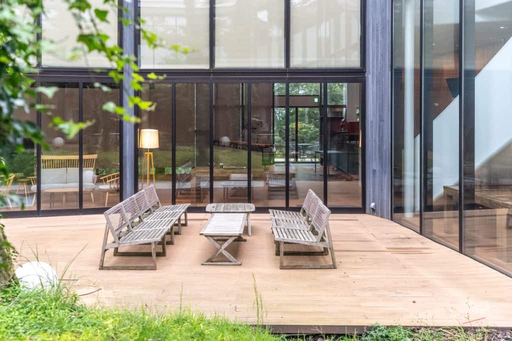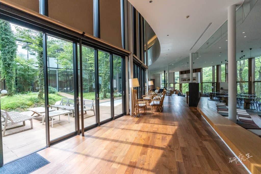 而中庭和外圍都有庭院,庭院中也有很多各式各樣的座位。我試著走到室內外每一個可以坐的椅子上面感受,在箱根的飯店裡面第一次有一種「來箱根感受當地人週末別莊」的心情。因為房間數少,房客也少,飯店沒有提供太多的服務,讓我有當自己家,隨意走走。