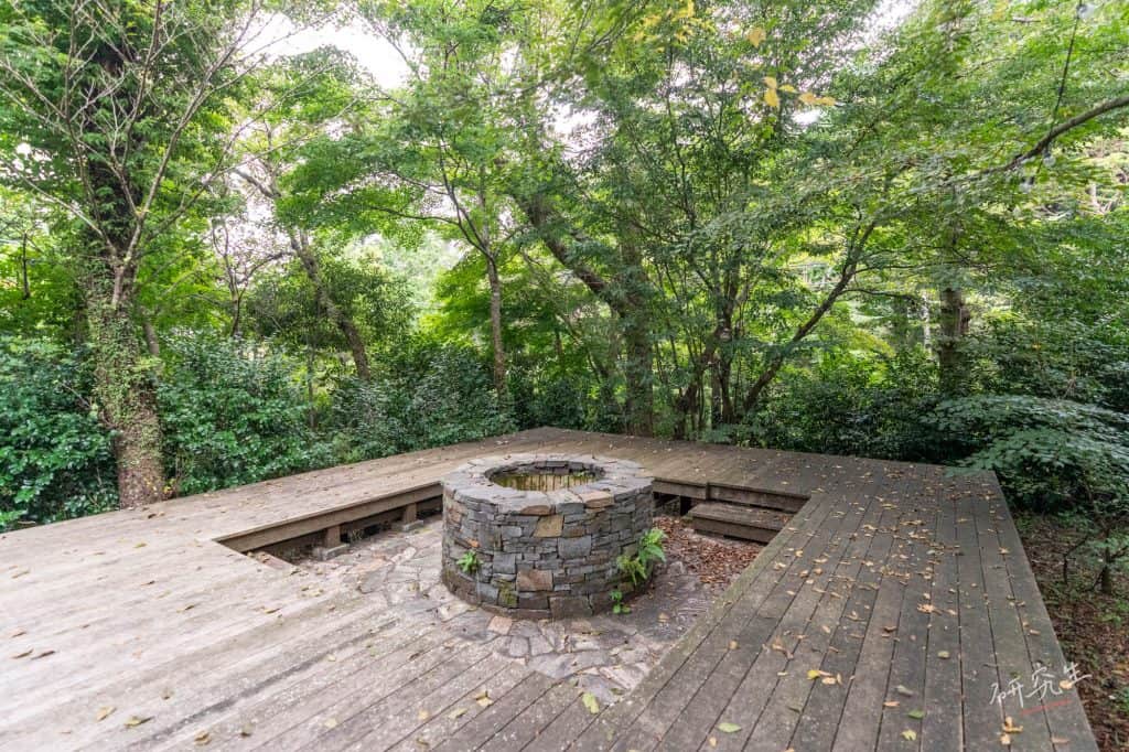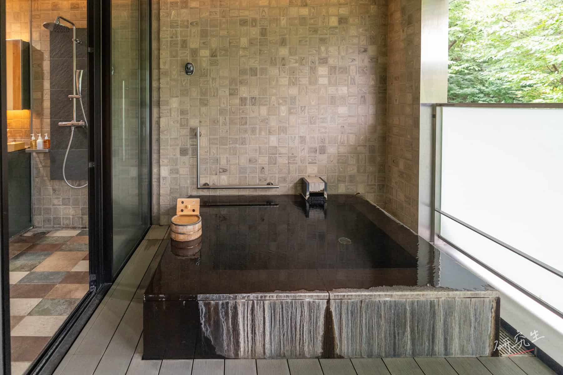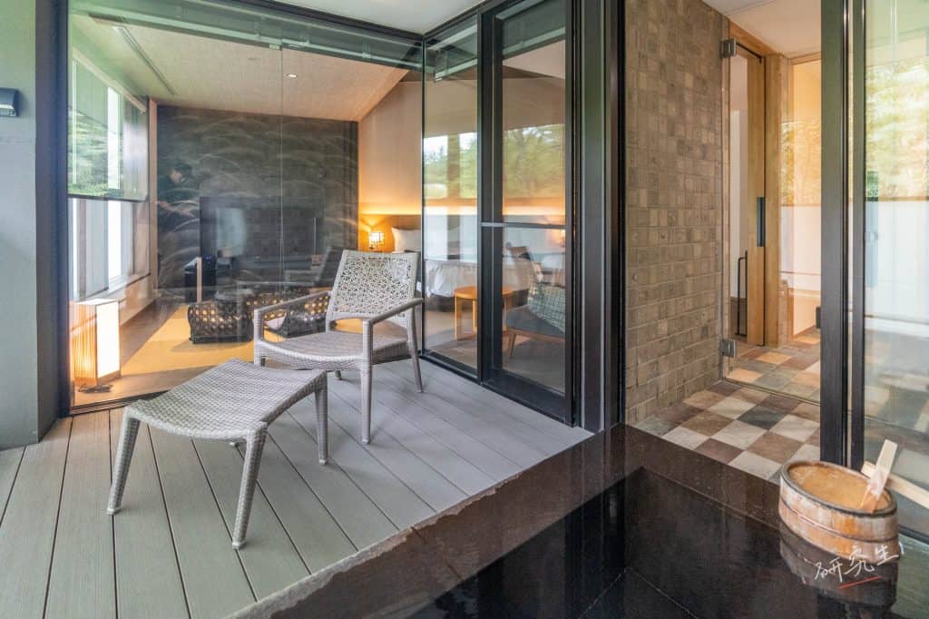 戶外的空間中,除了溫泉池之外,還有躺椅可以坐在那邊發呆。也就是說,溫泉泡了一陣子,馬上就可以起來坐在旁邊望著外面的綠色園景,休息一下之後再回去繼續泡溫泉。我就這樣在自己房間的露天溫泉池裡面泡了一個半小時。