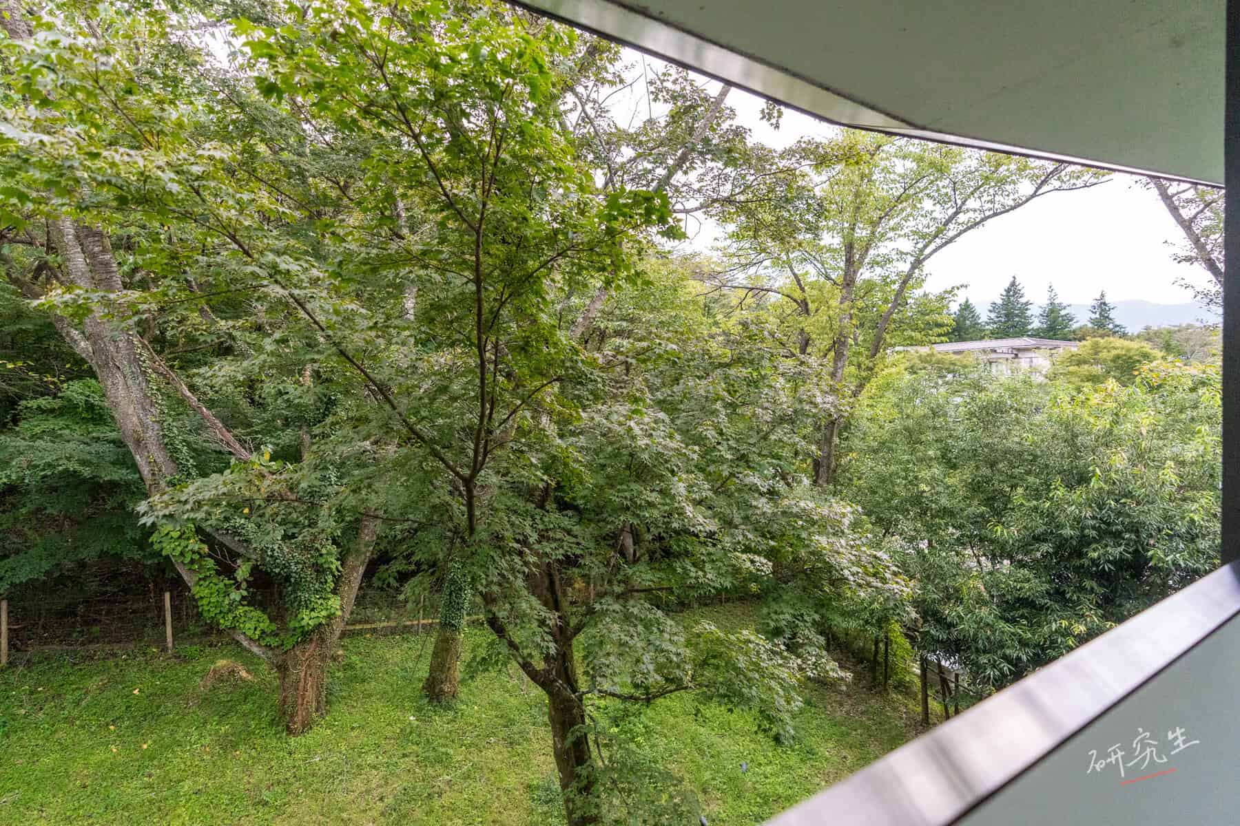 飯店的造型是一個圓形,中間有一個中庭,圍著一圈都是落地窗。我去的季節是夏天的尾巴,看出去都是一整片綠油油的,非常舒服。中庭也有一些楓葉,想必在秋天又會是另一個感受。